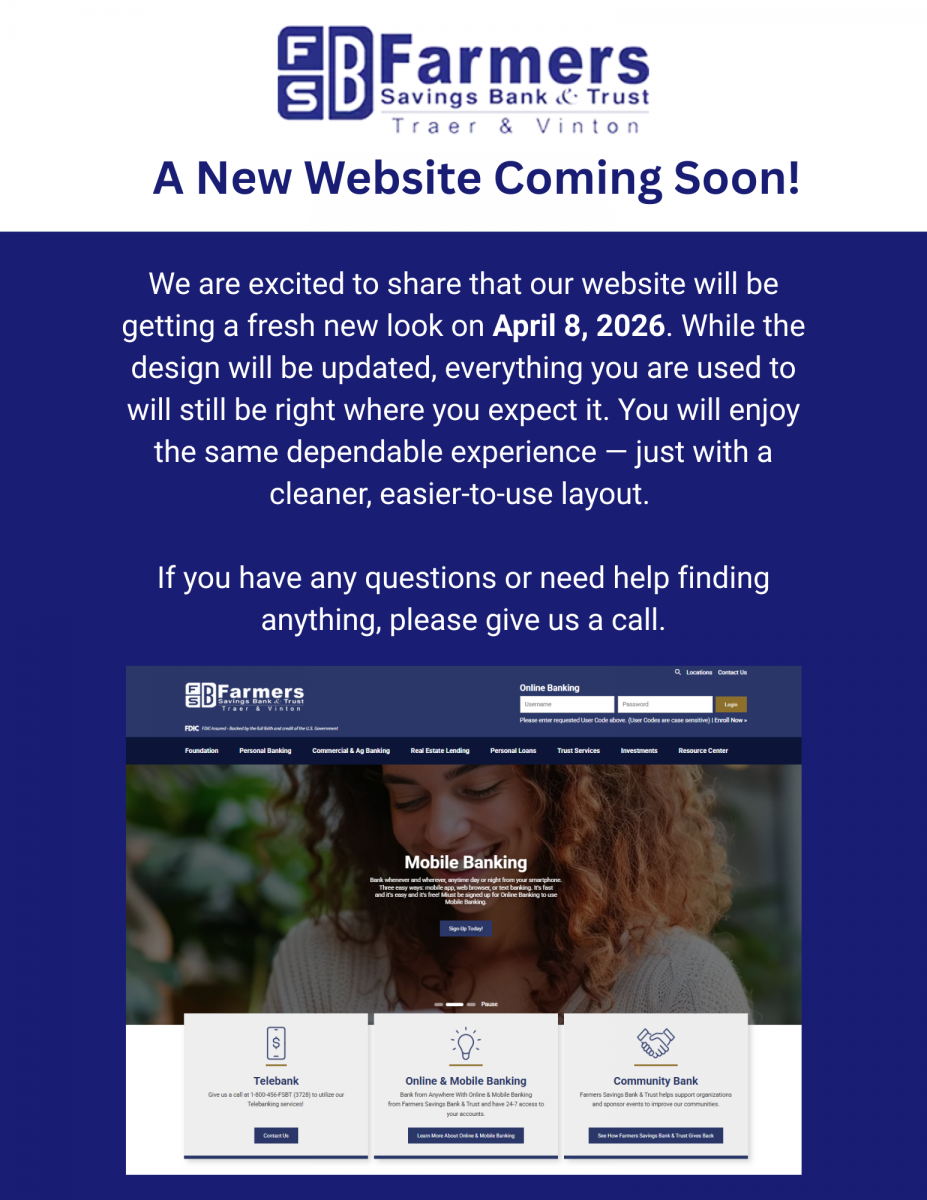 Want to bank from anywhere? With Online & Mobile Banking from Farmers Savings Bank & Trust you have 24-7 access to your bank accounts in the palm of your hand or on your computer.